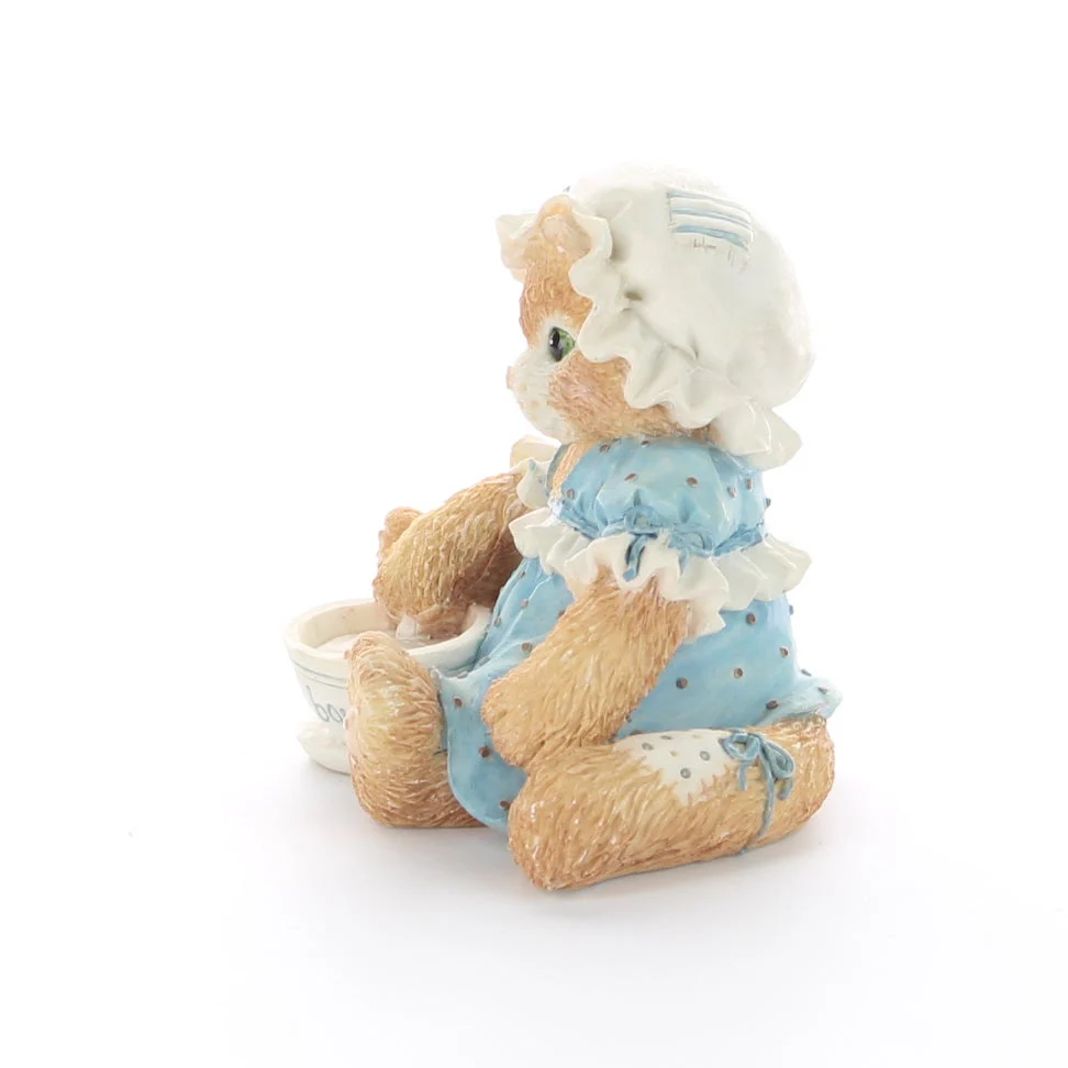 This is a retired vintage figurine from The Calico Kittens Collection. Designed by Priscilla Hillman and produced by Enesco, this piece is named 'An Unexpected Treat' and is Catalog Style #112321. It is a vintage collectible that was made in 1994.