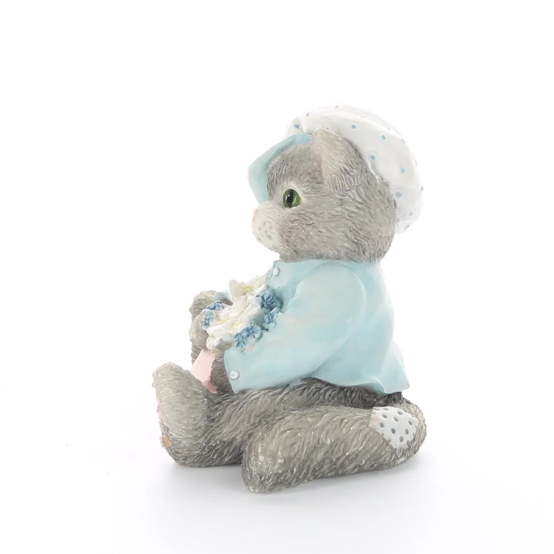 This is a retired vintage figurine from The Calico Kittens Collection. Designed by Priscilla Hillman and produced by Enesco, this piece is named 'My Love Blossoms For You' and is Catalog Style #102547. It is a vintage collectible that was made in 1994.